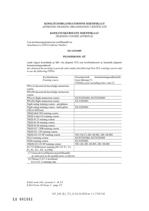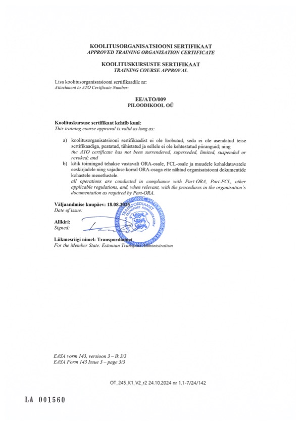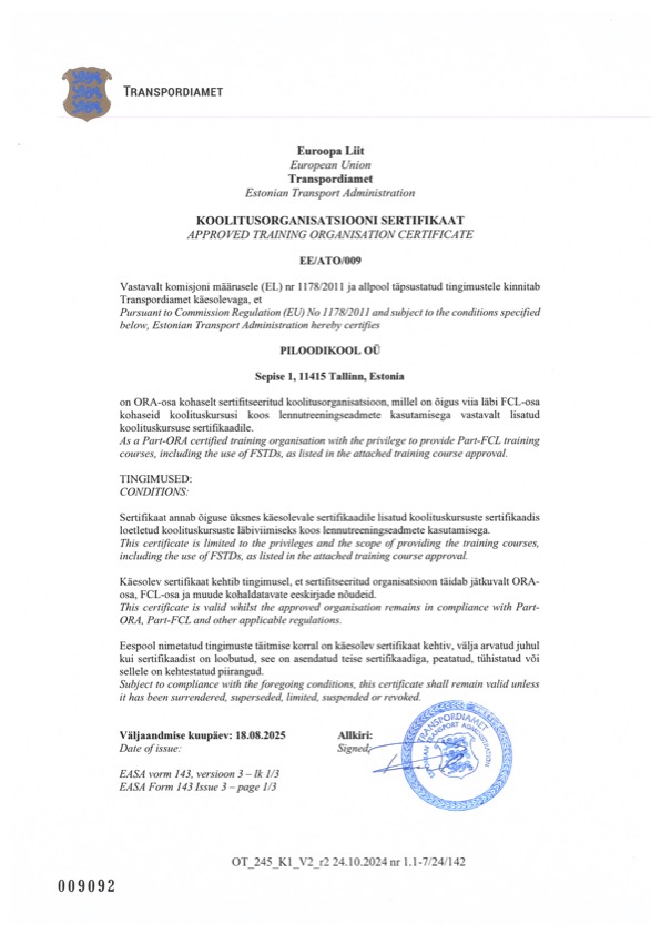 Piloodikool on Transpordiameti poolt sertifitseeritud koolitusorganisatsioon EE/ATO/009.